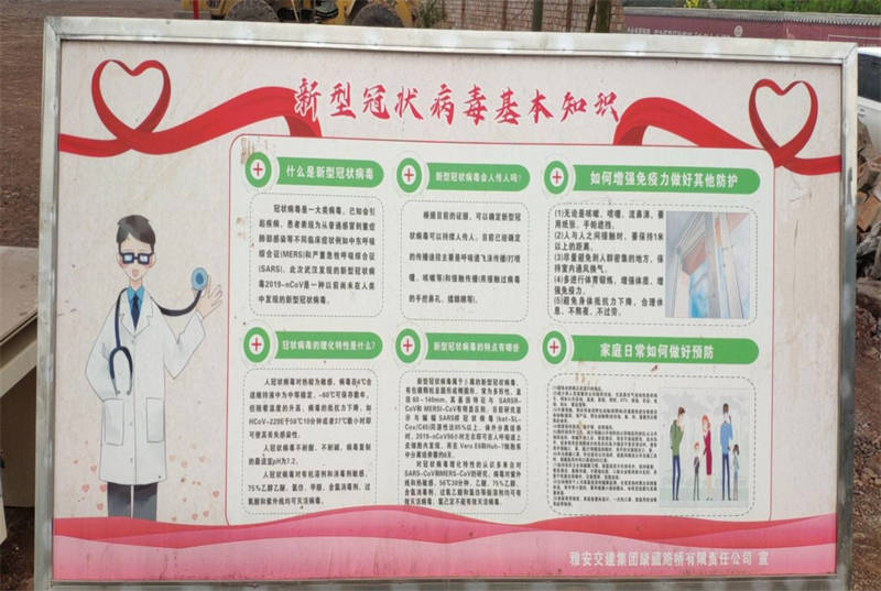 一是創(chuàng)新宣傳形式,利用公司QQ群、微信群、推送《中華人民共和國傳染病防治法》、《四川省應(yīng)對新冠肺炎疫情分區(qū)分級差異化防控指南(第二版)》、《雅安市新型冠狀病毒肺炎疫情防控工作要點(diǎn)指引》等法律法規(guī),每日持續(xù)有效的傳播疫情防控的信息,加大健康教育宣傳,引導(dǎo)職工不信謠不傳謠,營造良好的輿論環(huán)境。二是落實責(zé)任主體,在公司、各項目部張貼疫情防控法制宣傳展板、懸掛宣傳橫幅、發(fā)放防控宣傳冊,設(shè)立疫情防控教育專欄,向項目參建人員宣講疫情防控知識,做好疫情群防群治工作,營造濃厚的防控宣傳氛圍。三是精準(zhǔn)發(fā)力,組織已進(jìn)場勞務(wù)人員開展疫情防控及復(fù)工復(fù)產(chǎn)安全教育培訓(xùn),確保項目復(fù)工復(fù)產(chǎn)和疫情防控工作有序推進(jìn)。