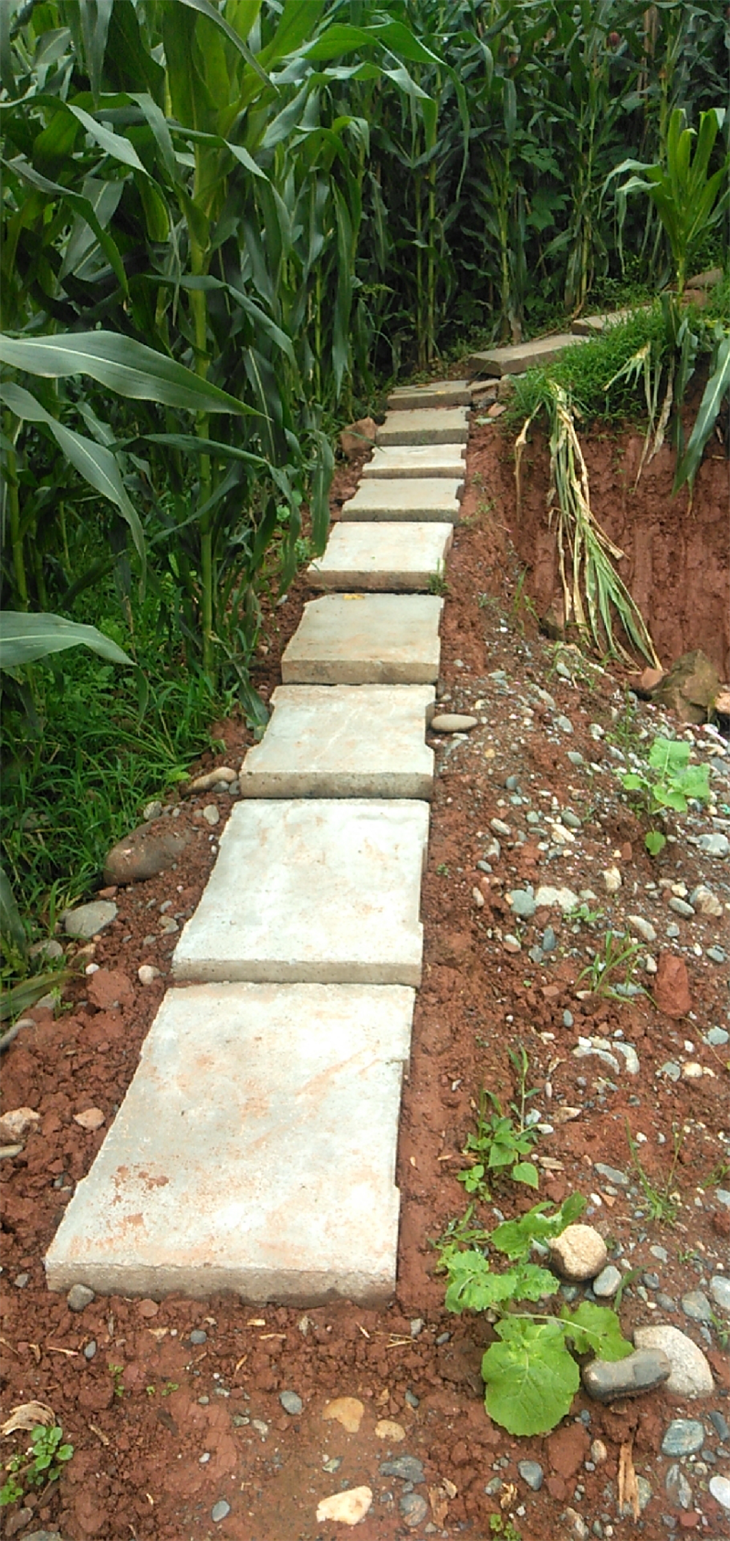 在蘆山縣佛圖山項(xiàng)目建設(shè)中,路橋公司蘆山寶興片區(qū)臨時(shí)黨支部了解到此處有一段便道坑洼不平,遇到雨季道路泥濘,嚴(yán)重影響村民的生活和生產(chǎn),且存在一定的安全隱患。為此,臨時(shí)黨支部主動(dòng)提出要為群眾修補(bǔ)便道,原本只是一個(gè)帶斜角的陡坡,通過加蓋水泥預(yù)制板臺(tái)階,便道變得平整起來?紤]到出行的方便性,還將便道與通村馬路連接在一起,受到當(dāng)?shù)匕傩盏母叨荣潛P(yáng),群眾出行難題得到有效解決。