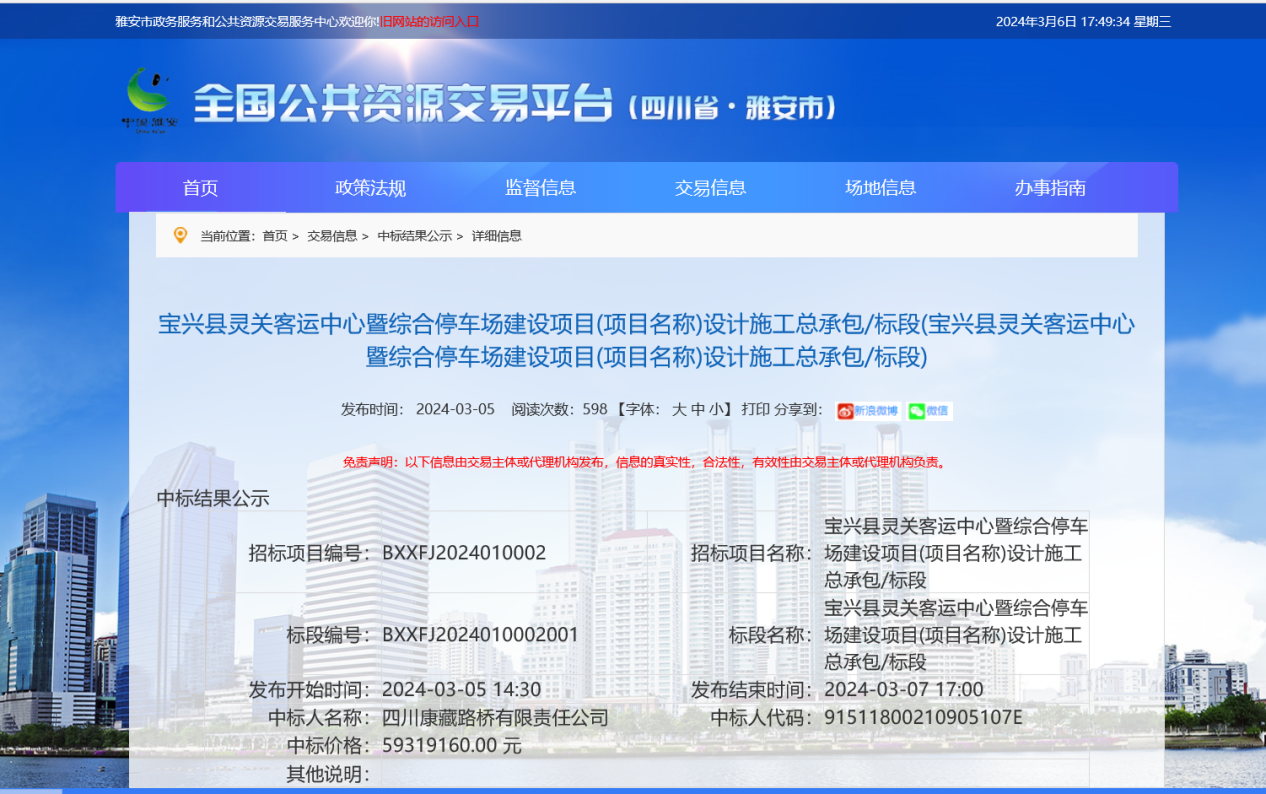 喜訊!雅安交建集團康藏路橋公司中標寶興縣靈關客運中心暨綜合停車場建設項目