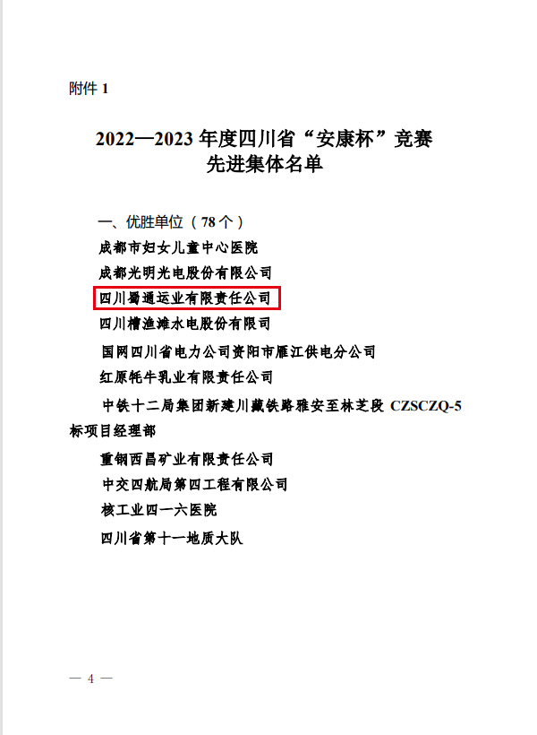 日前,省總工會、省應(yīng)急管理廳、省衛(wèi)健委聯(lián)合發(fā)文表揚2022-2023年度四川省“安康杯”競賽先進(jìn)集體和先進(jìn)個人,蜀通公司被評為“優(yōu)勝單位”。