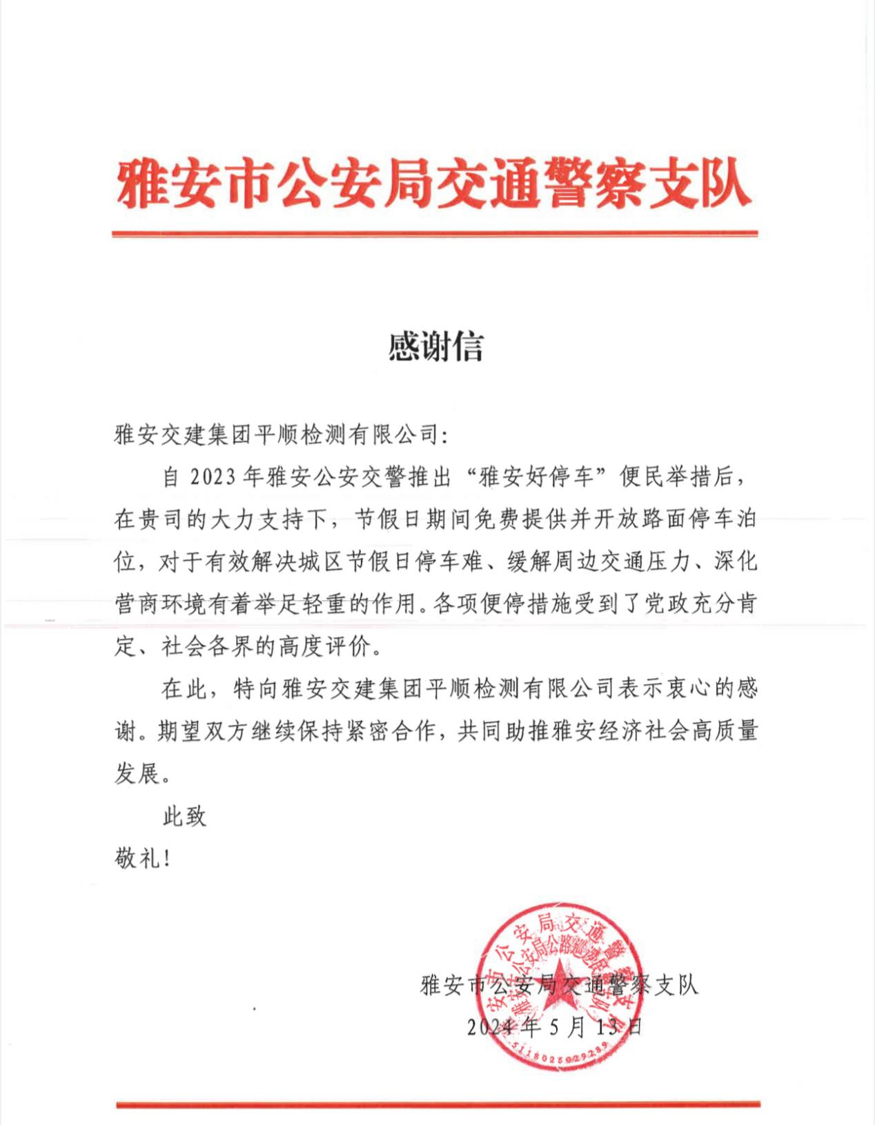 近日,雅安交建集團(tuán)平順公司收到一封來自雅安市公安局交通警察支隊的感謝信,對平順公司積極響應(yīng)雅安公安交警“雅安好停車”便民措施,在節(jié)假日期間免費(fèi)提供并開放路面停車泊位表示感謝。