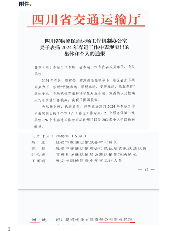 近日,交建集團(tuán)蜀通公司副總經(jīng)理謝斌獲四川省交通運(yùn)輸廳2024年春運(yùn)工作表現(xiàn)突出通報(bào)表揚(yáng)。