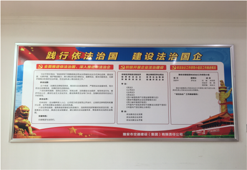 三是印發(fā)《雅安市交通建設(shè)(集團)有限責(zé)任公司依法治企法律法規(guī)文件匯編》至公司領(lǐng)導(dǎo)班子成員與高管,作為會前學(xué)法材料與自學(xué)材料;制作依法治企宣傳展板,懸掛于公司內(nèi)部進(jìn)行法治宣傳工作。