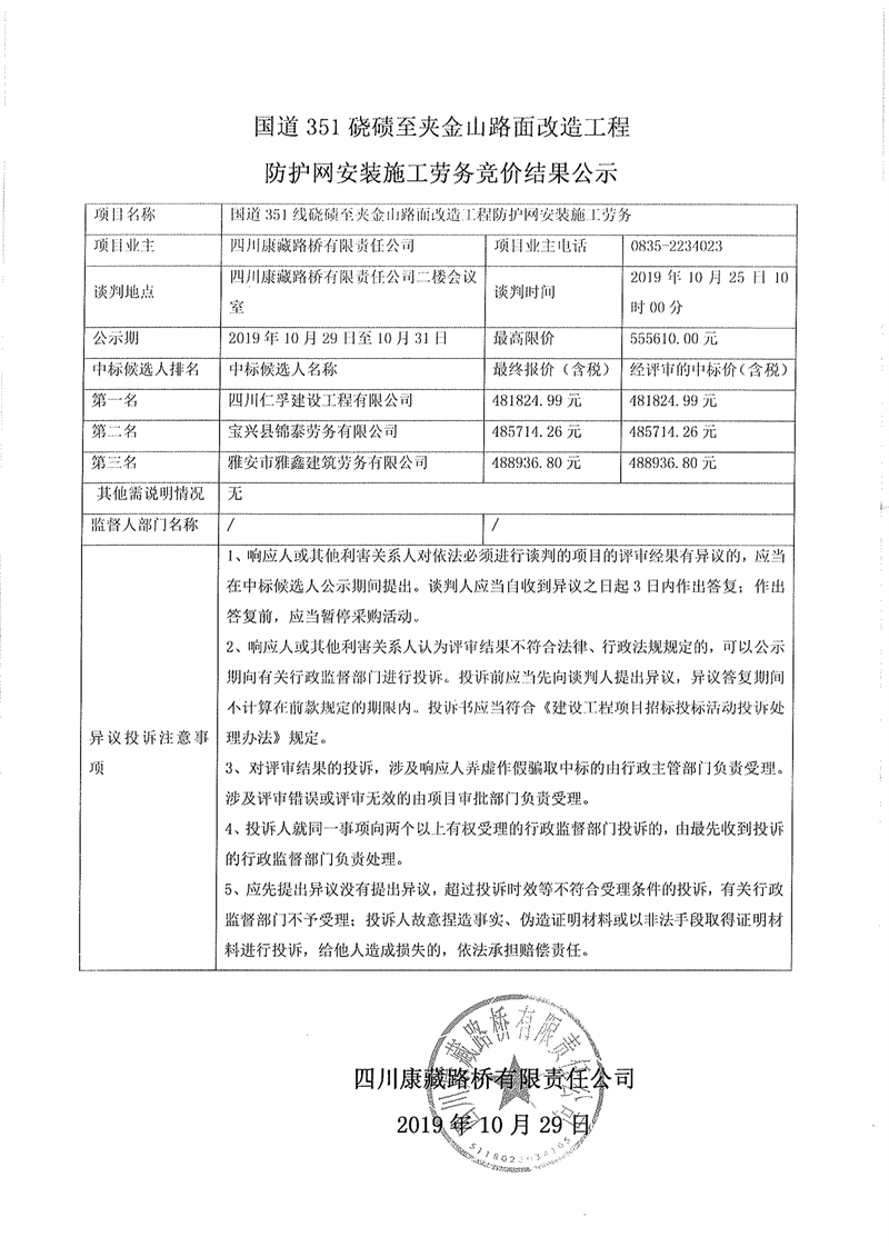 四川康藏路橋有限責任公司國道351磽磧至夾金山路面改造工程防護網安裝施工勞務競價結果公示