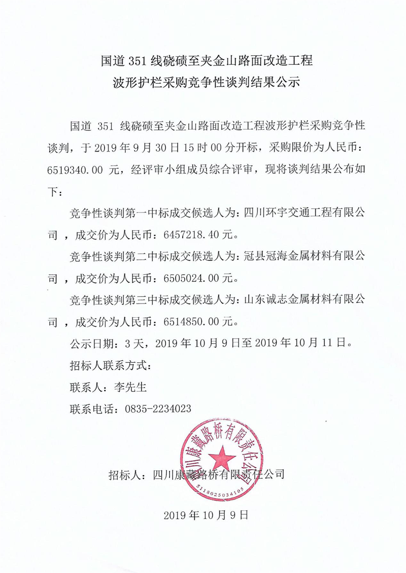 四川康藏路橋有限責(zé)任公司國道351線磽磧至夾金山路面改造工程波形護(hù)欄采購競(jìng)爭(zhēng)性談判結(jié)果公示