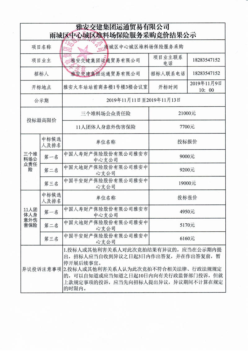 雅安交建集團運通貿(mào)易有限公司雨城區(qū)中心城區(qū)堆料場保險服務采購競價結(jié)果公示