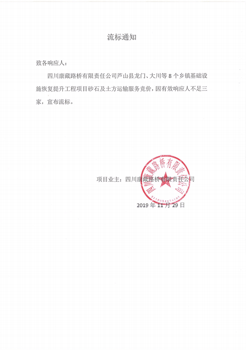 四川康藏路橋有限責(zé)任公司蘆山縣龍門(mén)、大川等8個(gè)鄉(xiāng)鎮(zhèn)基礎(chǔ)設(shè)施恢復(fù)提升工程項(xiàng)目砂石及土方運(yùn)輸服務(wù)競(jìng)價(jià)流標(biāo)通知