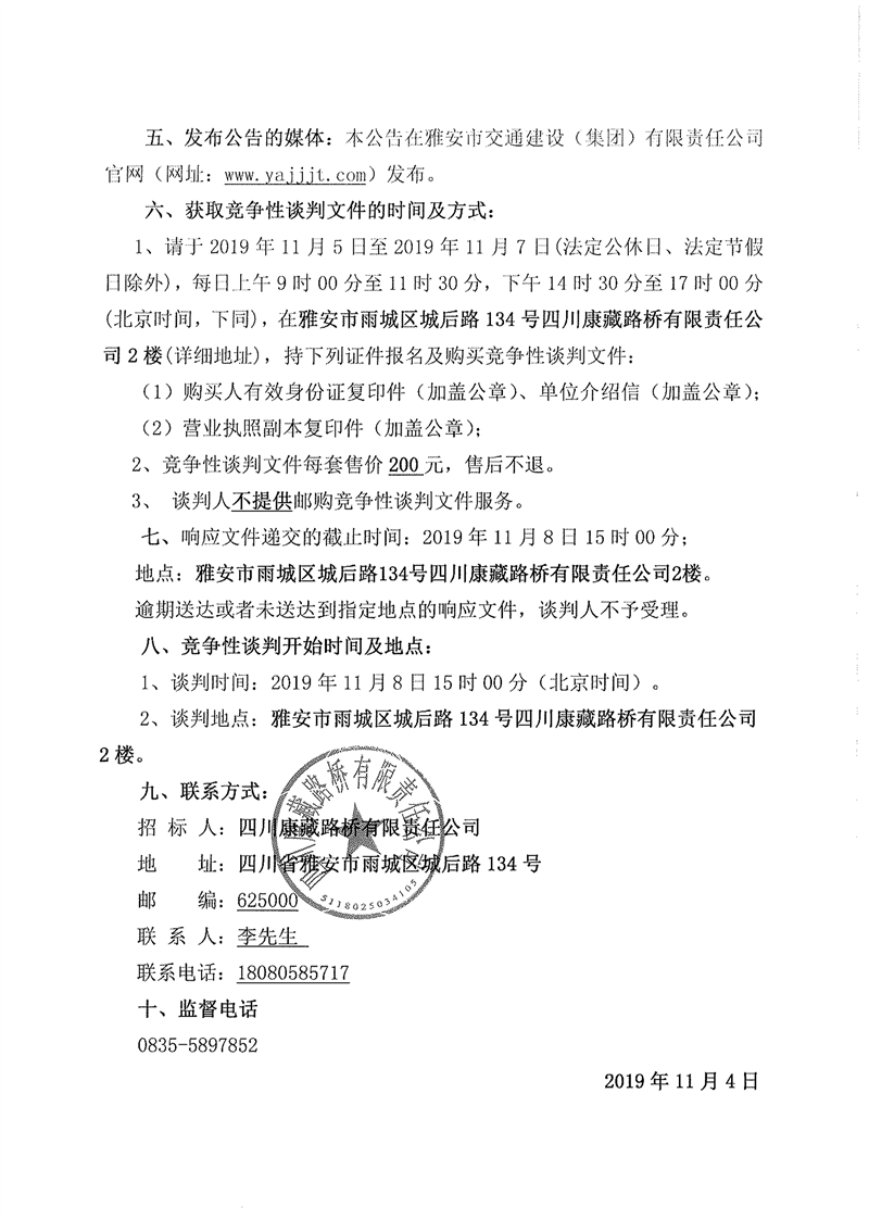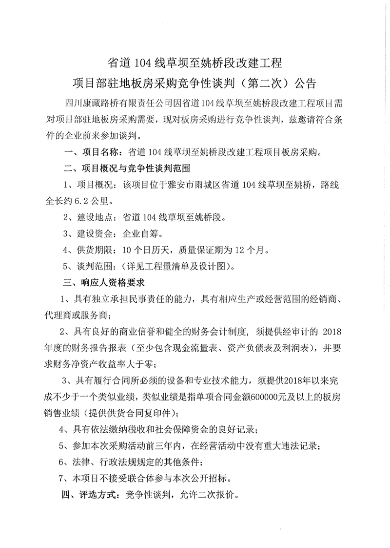 四川康藏路橋有限責(zé)任公司省道104線草壩至姚橋段改建工程項目部駐地板房采購競爭性談判(第二次)公告