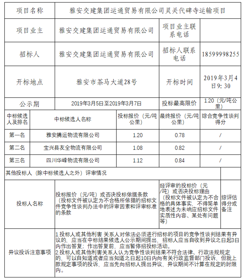 雅安交建集團運通貿易有限公司靈關代碑寺運輸項目競爭性談判結果公示