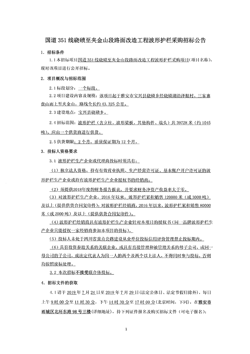 雅安交建集團路橋有限責任公司國道351線磽磧至夾金山段路面改造工程波形護欄采購招標公告