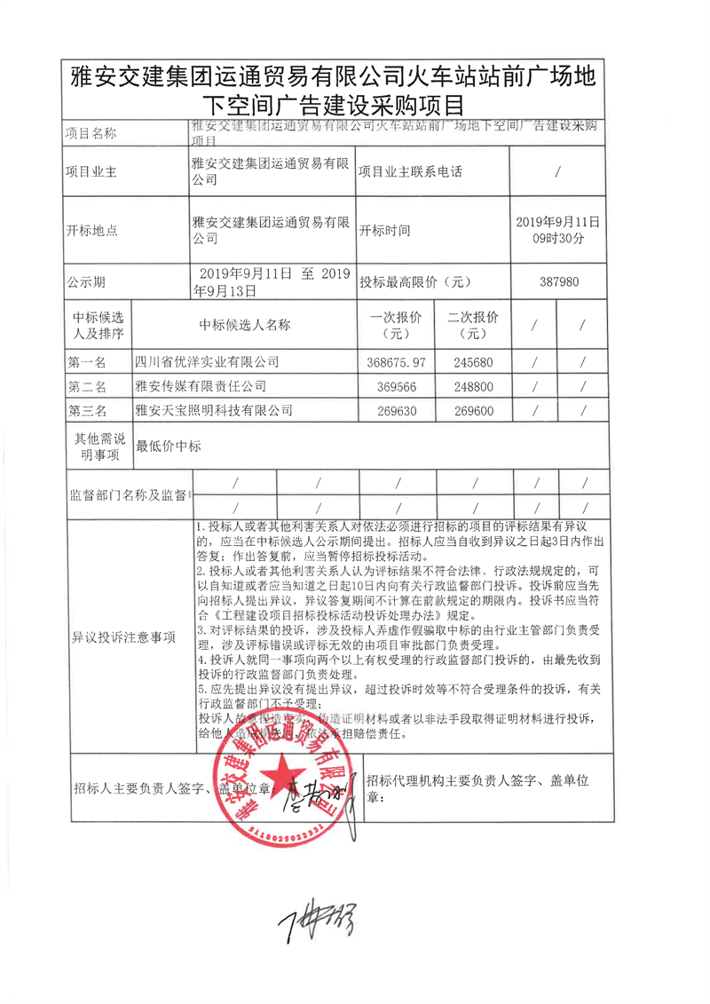 雅安交建集團運通貿(mào)易有限公司火車站站前廣場地下空間廣告建設采購項目結果公示
