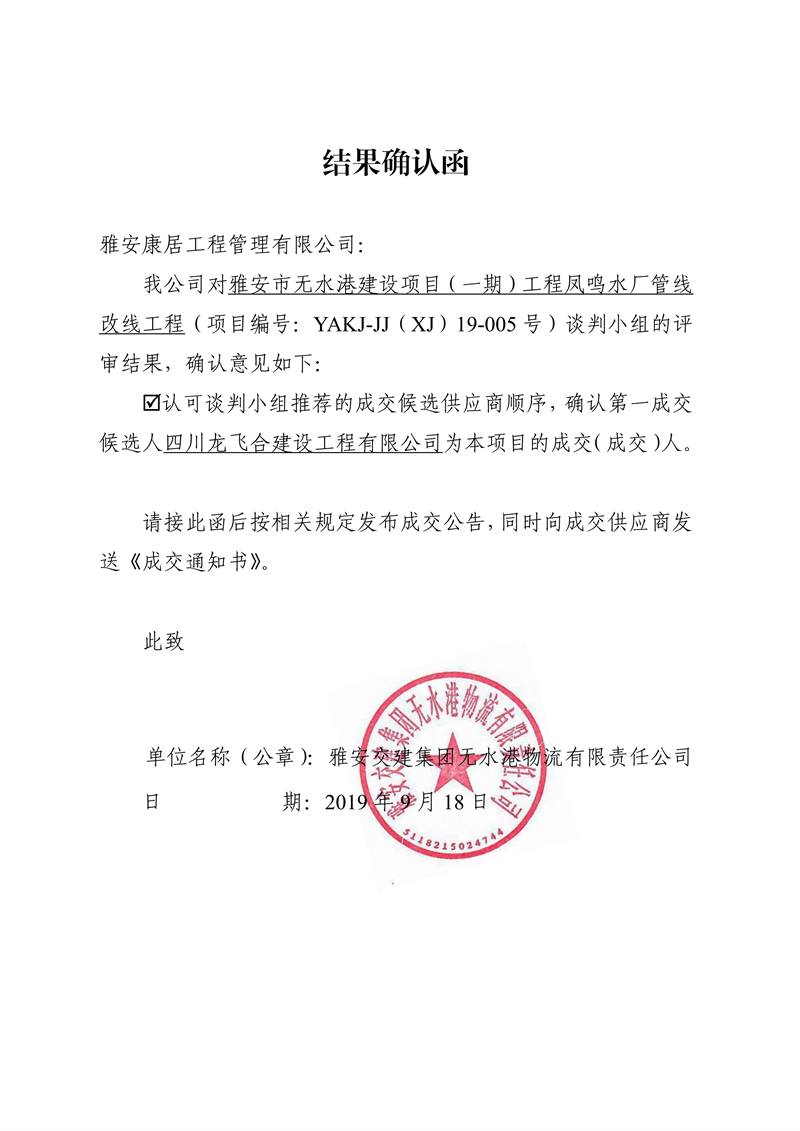 雅安交建集團(tuán)無水港物流有限責(zé)任公司雅安市無水港建設(shè)項目(一期)工程鳳鳴水廠管線改線工程競爭性談判結(jié)果公示