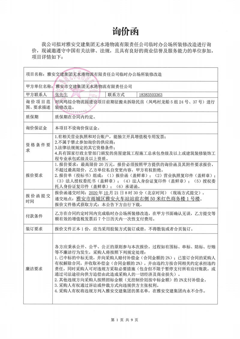 雅安交建集團無水港物流有限責(zé)任公司臨時辦公場所裝修改造詢價函