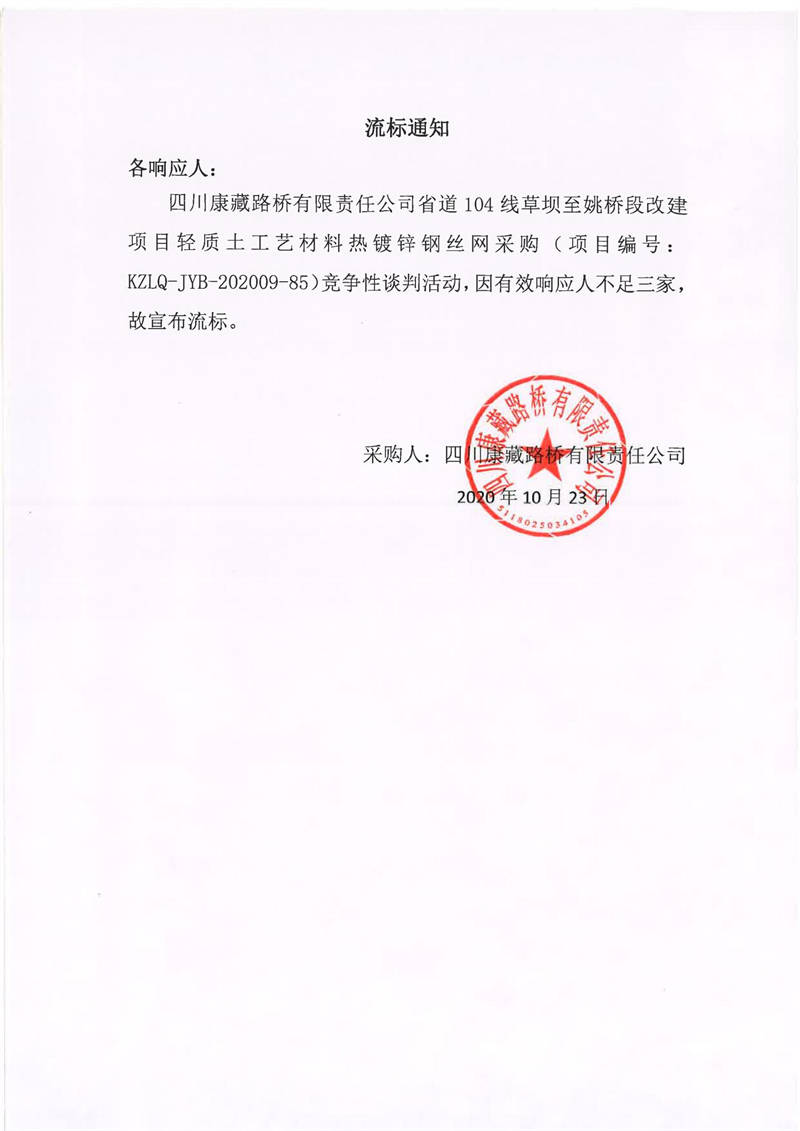 四川康藏路橋有限責(zé)任公司省道104線草壩至姚橋段改建項目輕質(zhì)土工藝材料熱鍍鋅鋼絲網(wǎng)采購項目流標(biāo)通知