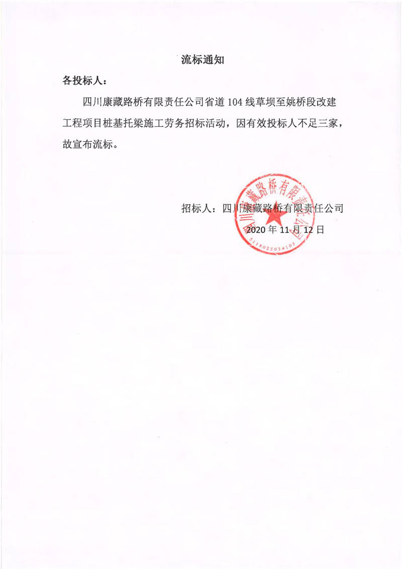 四川康藏路橋有限責(zé)任公司省道104線草壩至姚橋段改建工程項(xiàng)目樁基托梁施工勞務(wù)流標(biāo)通知