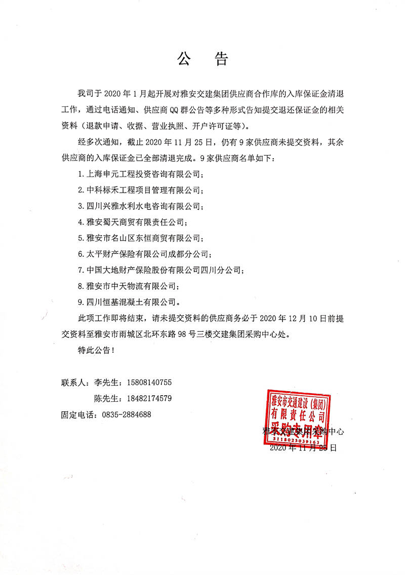 關(guān)于雅安交建集團(tuán)供應(yīng)商合作庫(kù)入庫(kù)保證金清退相關(guān)事宜的公告