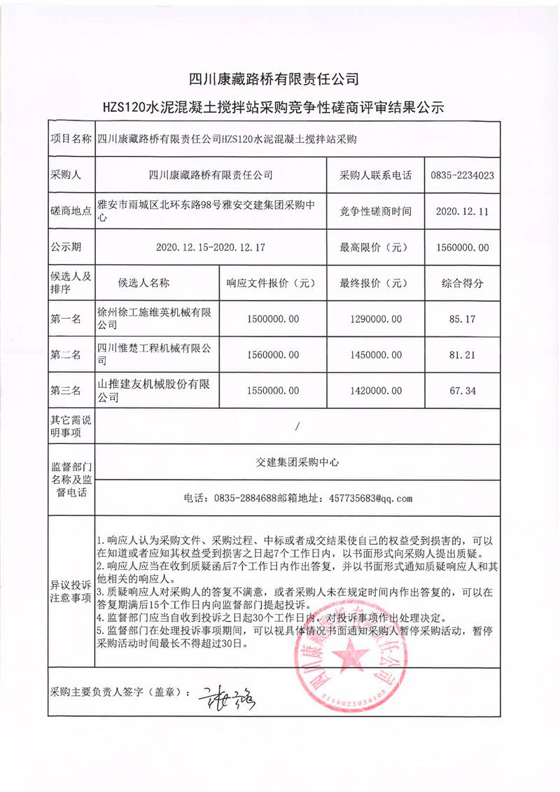 四川康藏路橋有限責任公司HZS120水泥混凝土攪拌站采購競爭性磋商結(jié)果公示