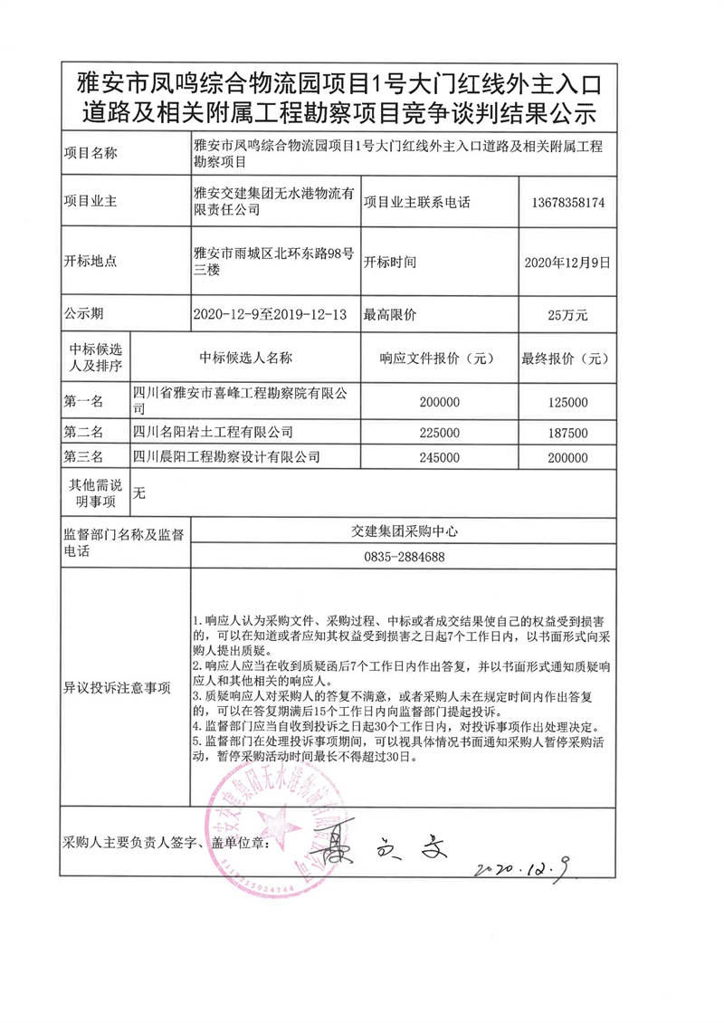 雅安交建集團無水港物流有限責任公司雅安市鳳鳴綜合物流園項目1號大門紅線外主入口道路及相關(guān)附屬工程勘察項目競爭談判結(jié)果公示