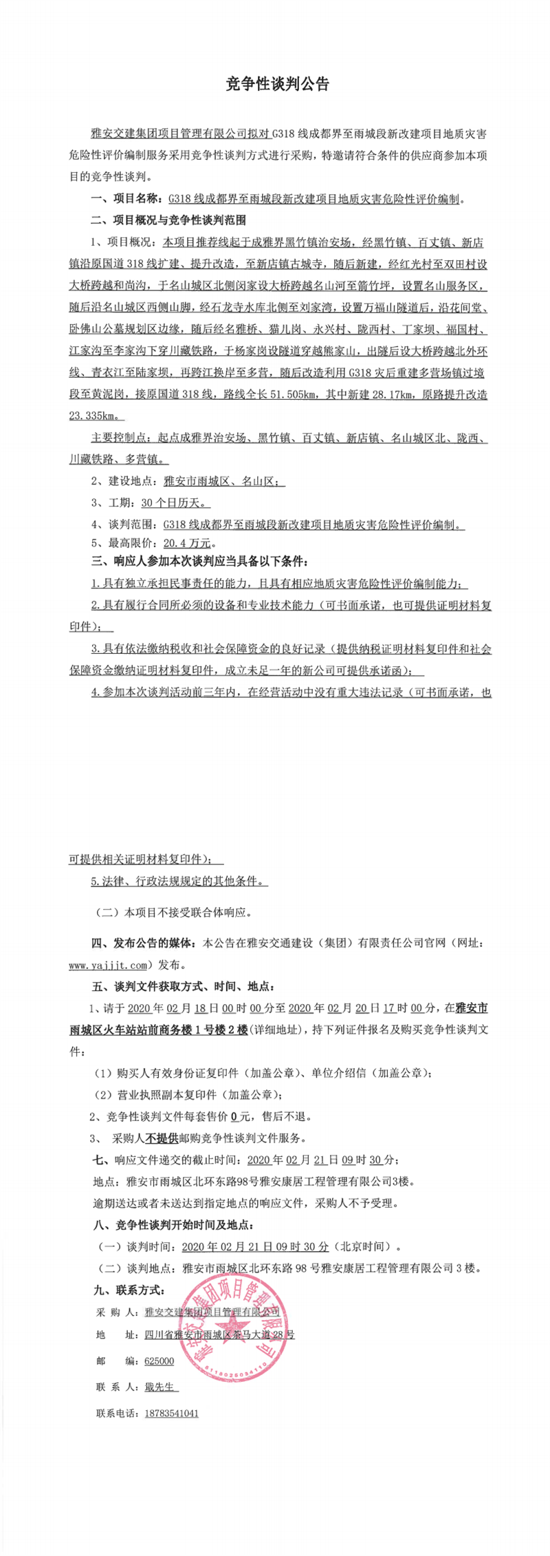 雅安交建集團項目管理有限公司G318線成都界至雨城段新改建項目地質災害危險性評價編制競爭性談判公告