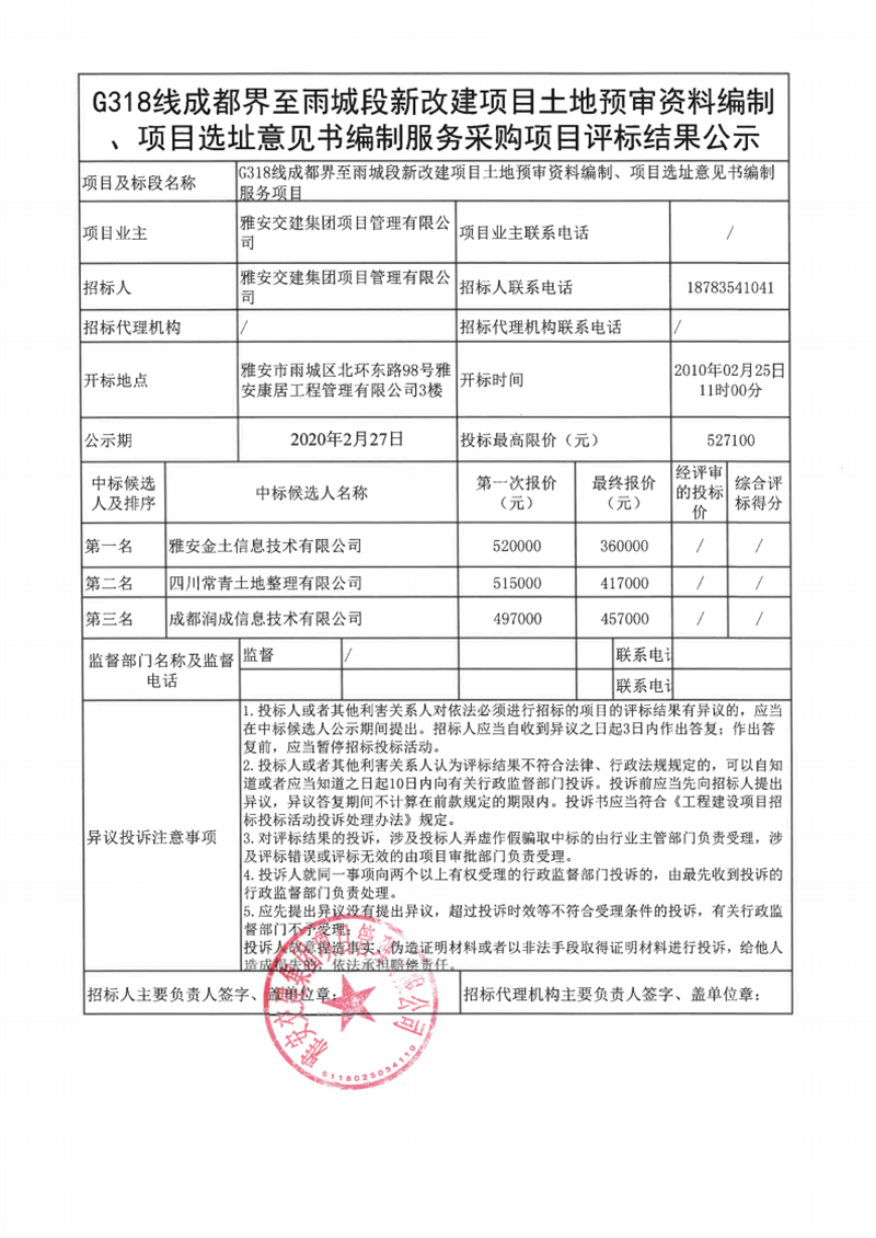 雅安交建集團項目管理有限公司G318線成都界至雨城段新改建項目土地預審資料編制、項目選址意見書編制服務采購項目評標結果公示