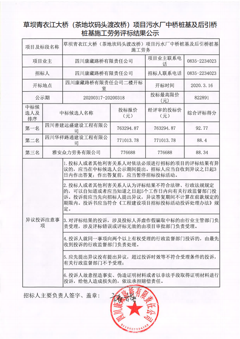 四川康藏路橋有限責(zé)任公司草壩青衣江大橋(茶地坎碼頭渡改橋)項(xiàng)目污水廠中橋樁基及后引橋樁基施工勞務(wù)評(píng)標(biāo)結(jié)果公示