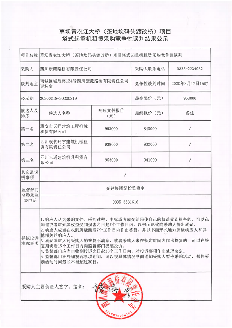 四川康藏路橋有限責(zé)任公司草壩青衣江大橋(茶地坎渡改橋)項(xiàng)目塔式起重機(jī)租賃采購(gòu)競(jìng)爭(zhēng)性談判結(jié)果公示
