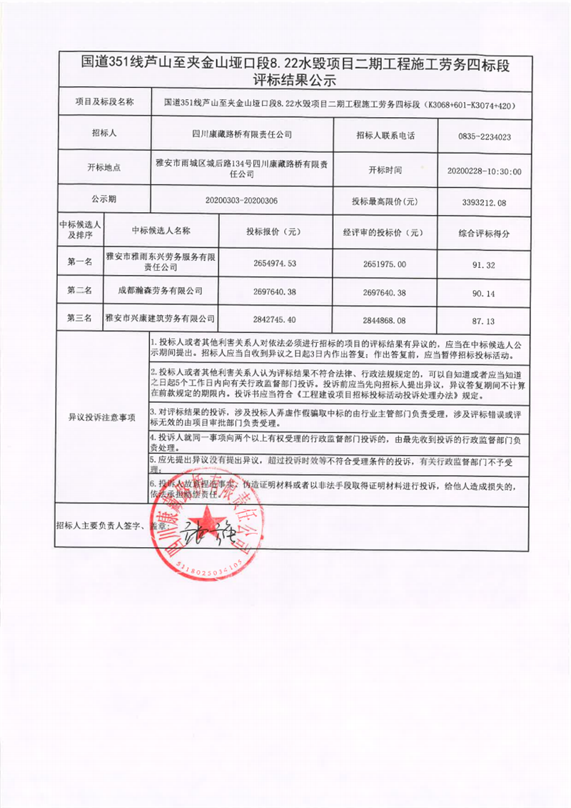 四川康藏路橋有限責(zé)任公司國(guó)道351線(xiàn)蘆山至夾金山埡口段8.22水毀項(xiàng)目二期工程施工勞務(wù)四標(biāo)段評(píng)標(biāo)結(jié)果公示