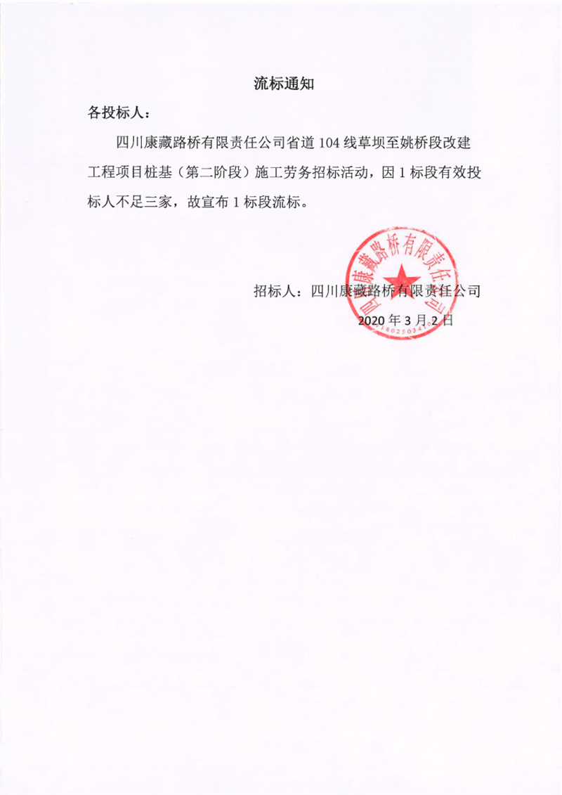 四川康藏路橋有限責(zé)任公司省道104線草壩至姚橋段改建工程項目樁基(第二階段)施工勞務(wù)流標(biāo)通知