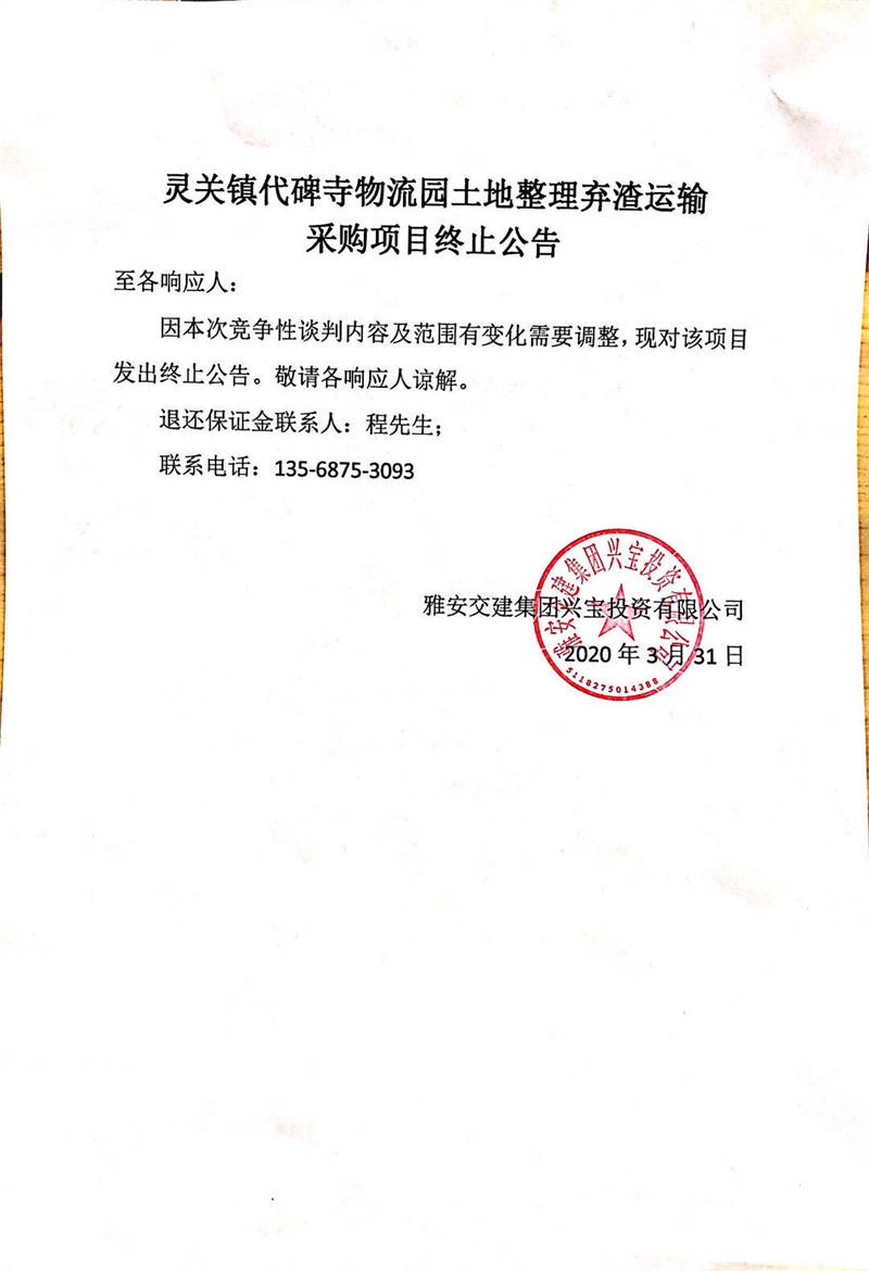 雅安交建集團(tuán)興寶投資有限公司靈關(guān)鎮(zhèn)代碑寺物流園土地整理棄渣運(yùn)輸采購項目終止公告