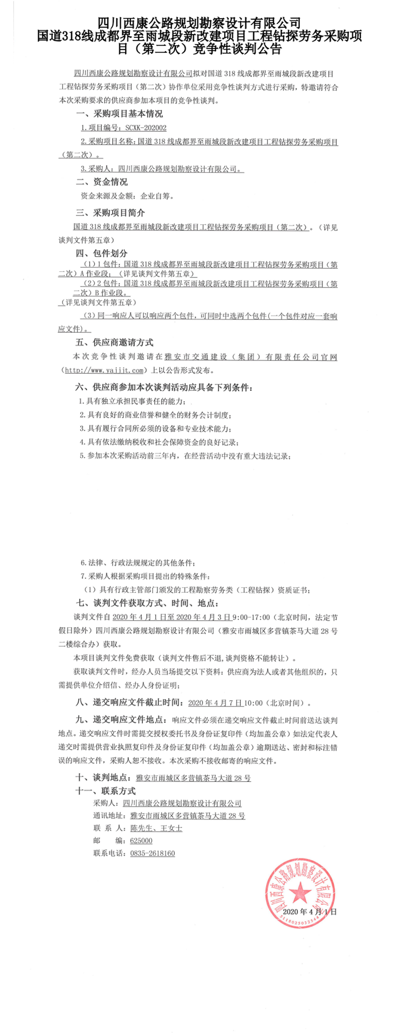 四川西康公路規(guī)劃勘察設(shè)計(jì)有限公司國(guó)道318線成都界至雨城段新改建項(xiàng)目工程鉆探勞務(wù)采購(gòu)項(xiàng)目(第二次)競(jìng)爭(zhēng)性談判公告