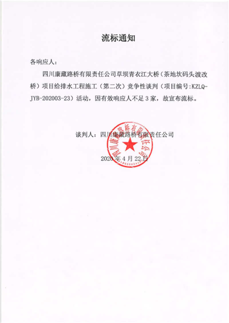 四川康藏路橋有限責任公司草壩青衣江大橋(茶地坎碼頭渡改橋)項目給排水工程施工(第二次)競爭性談判流標通知