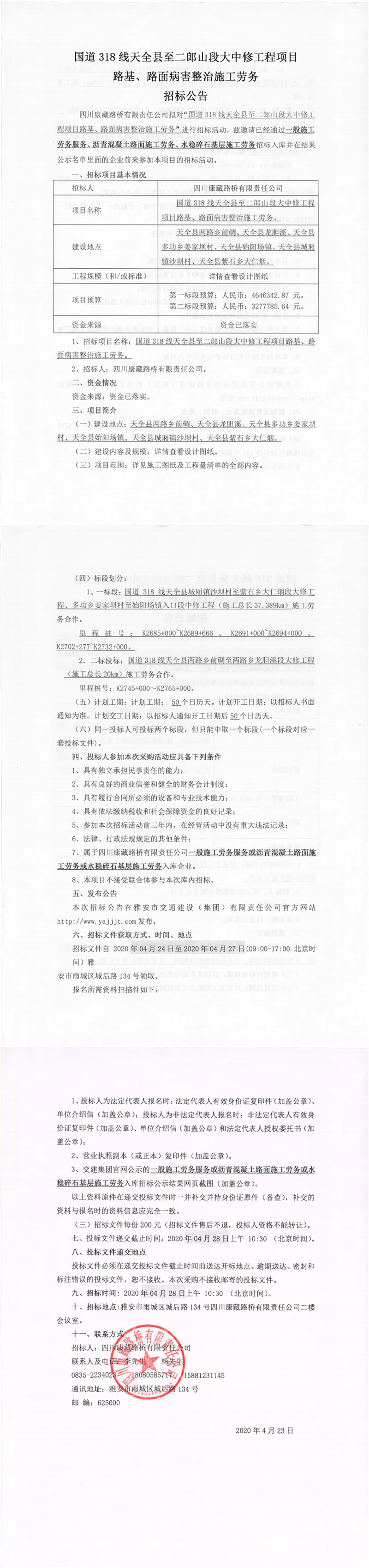 四川康藏路橋有限責任公司國道318線天全縣至二郎山段大中修工程項目路基、路面病害整治施工勞務招標公告