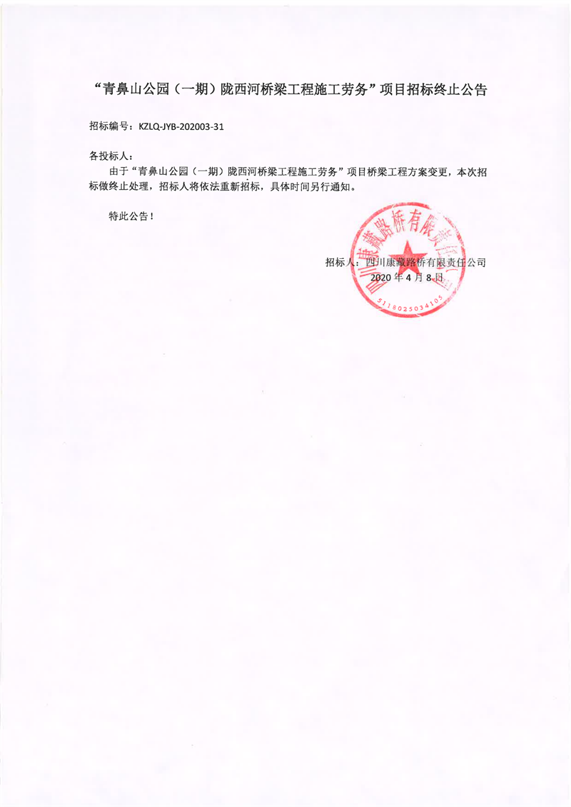 四川康藏路橋有限責(zé)任公司青鼻山公園(一期)隴西河橋梁工程施工勞務(wù)項目招標終止公告