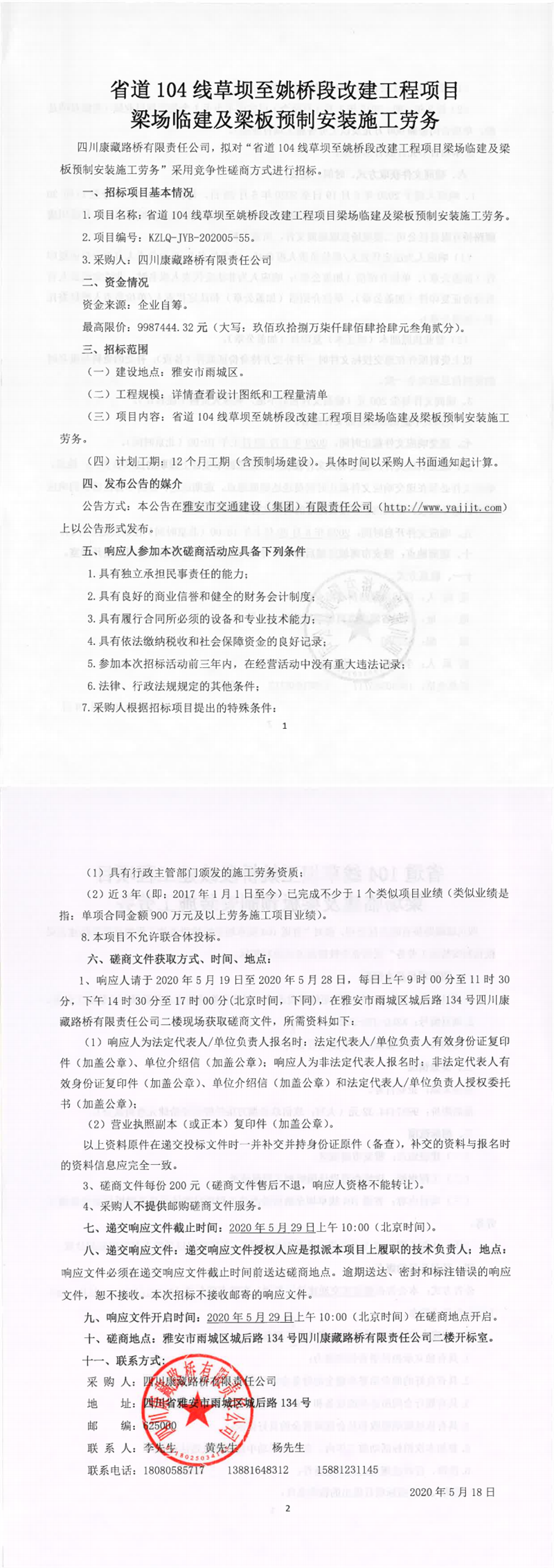 四川康藏路橋有限責任公司省道104線草壩至姚橋段改建工程項目梁場臨建及梁板預(yù)制安裝施工勞務(wù)競爭性磋商公告