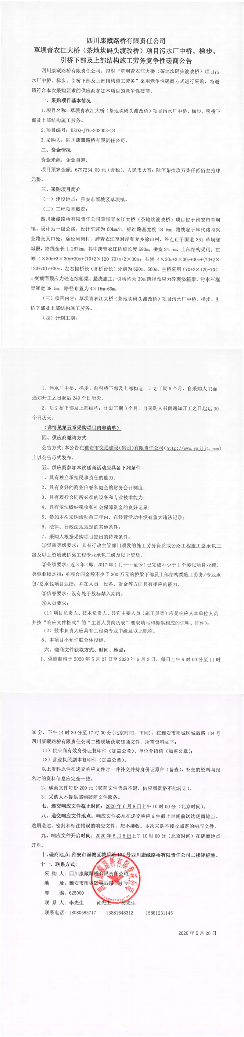 四川康藏路橋有限責任公司草壩青衣江大橋(茶地坎碼頭渡改橋)項目污水廠中橋、梯步、引橋下部及上部結構施工勞務競爭性磋商公告