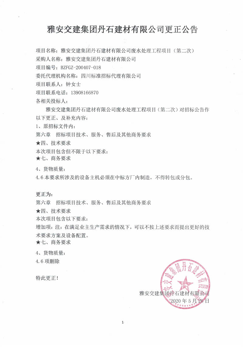 雅安交建集團(tuán)丹石建材有限公司廢水處理工程項(xiàng)目(第二次)更正公告