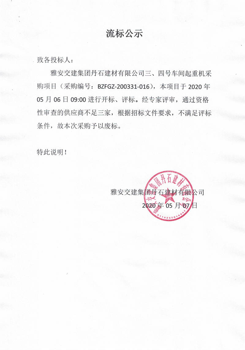 雅安交建集團丹石建材有限公司三、四號車間起重機采購項目流標公示