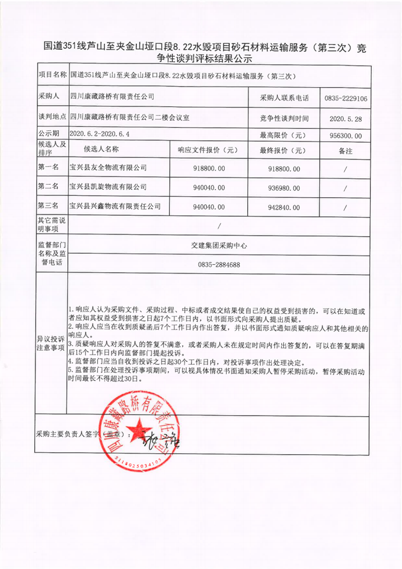 四川康藏路橋有限責任公司國道351線蘆山至夾金山埡口段8.22水毀項目砂石材料運輸服務(wù)(第三次)競爭性談判評標結(jié)果公示