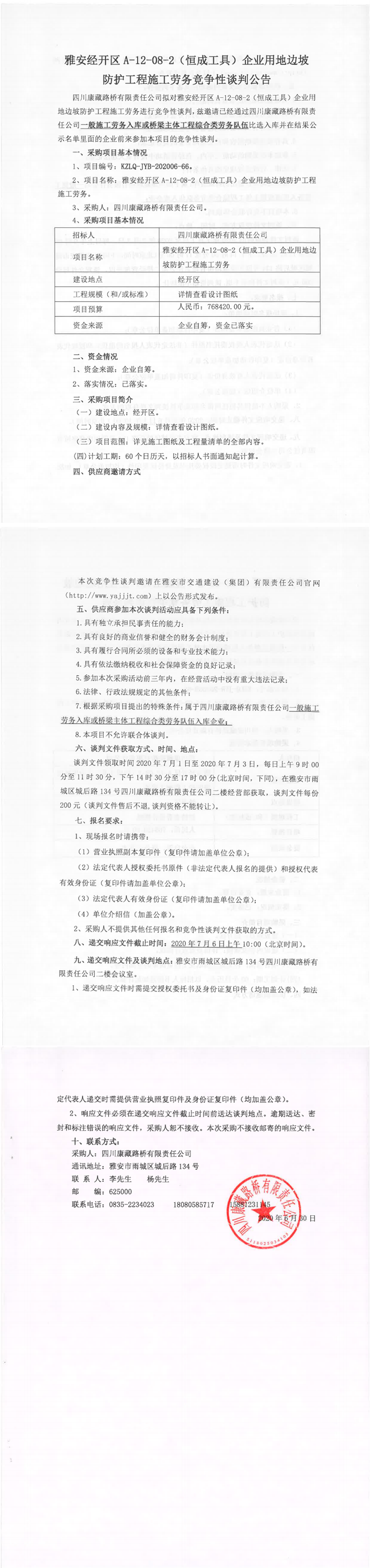 四川康藏路橋有限責(zé)任公司雅安經(jīng)開(kāi)區(qū)A-12-08-2(恒成工具)企業(yè)用地邊坡防護(hù)工程施工勞務(wù)競(jìng)爭(zhēng)性談判公告
