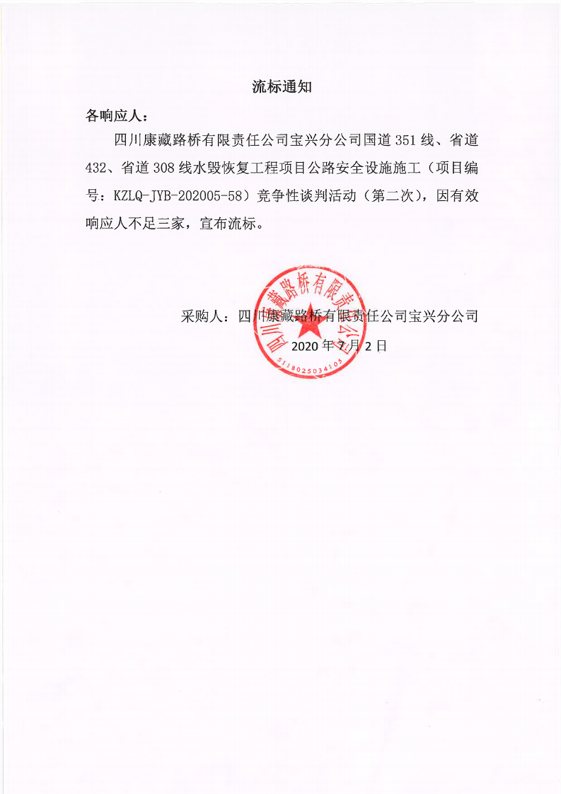 四川康藏路橋有限責(zé)任公司寶興分公司國(guó)道351線、省道432線、省道308線水毀恢復(fù)項(xiàng)目公路安全設(shè)施施工競(jìng)爭(zhēng)性談判(第二次)流標(biāo)通知