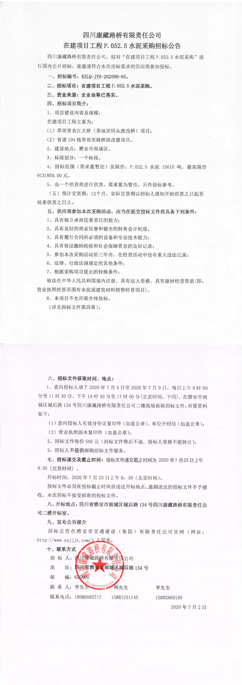 四川康藏路橋有限責任公司在建項目工程P.052.5水泥采購招標公告
