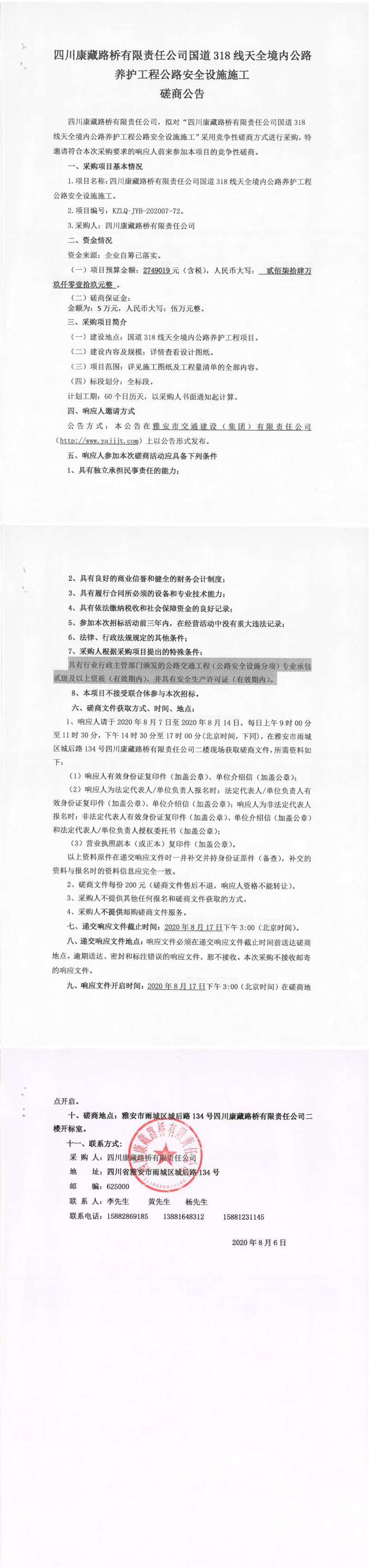 四川康藏路橋有限責(zé)任公司國道318線天全境內(nèi)公路養(yǎng)護(hù)工程公路安全設(shè)施施工磋商公告