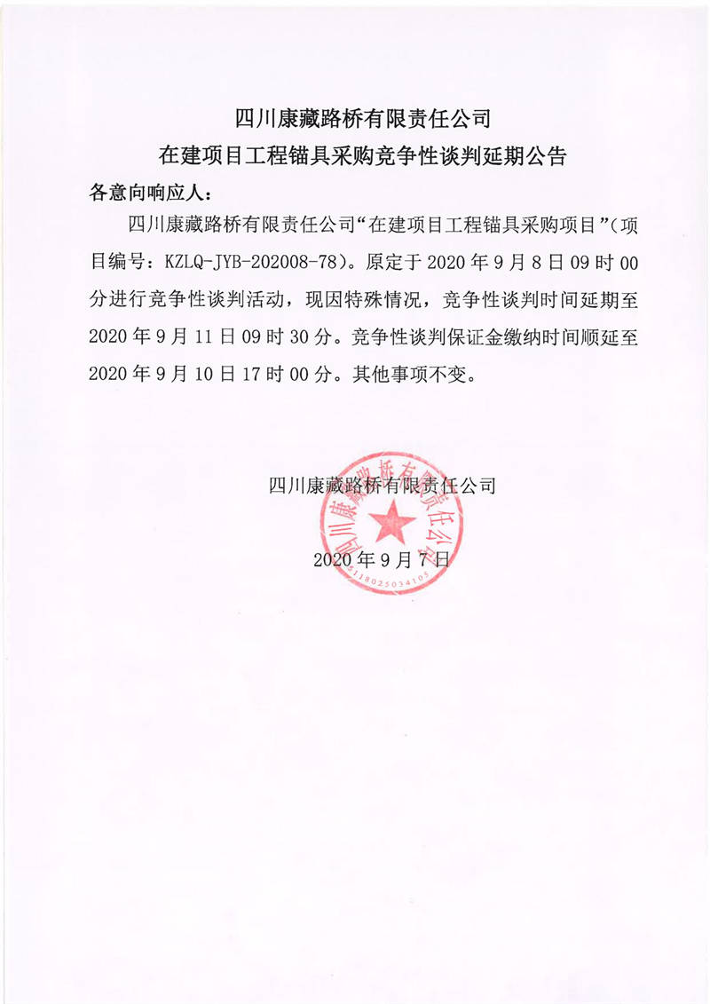 四川康藏路橋有限責任公司在建項目工程錨具采購競爭性談判延期公告