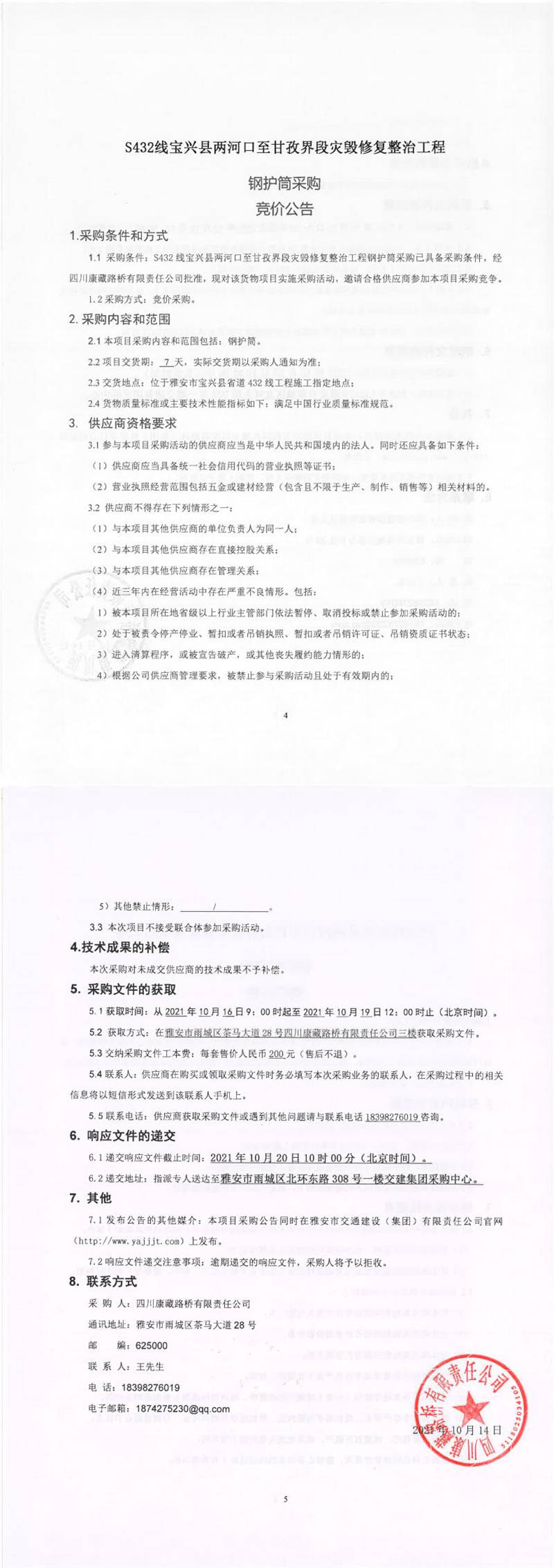 四川康藏路橋有限責(zé)任公司S432線寶興縣兩河口至甘孜界段災(zāi)毀修復(fù)整治工程鋼護(hù)筒采購(gòu)競(jìng)價(jià)公告