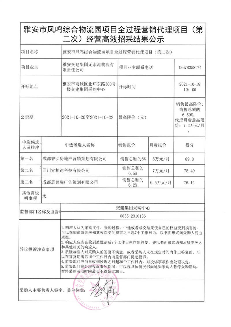 雅安交建集團(tuán)無(wú)水港物流有限責(zé)任公司雅安市鳳鳴綜合物流園項(xiàng)目全過(guò)程營(yíng)銷(xiāo)代理項(xiàng)目(第二次)經(jīng)營(yíng)高效招采結(jié)果公示