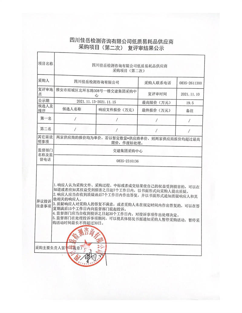 四川佳岳檢測(cè)咨詢有限公司低質(zhì)易耗品供應(yīng)商采購(gòu)項(xiàng)目(第二次)復(fù)評(píng)審結(jié)果公示