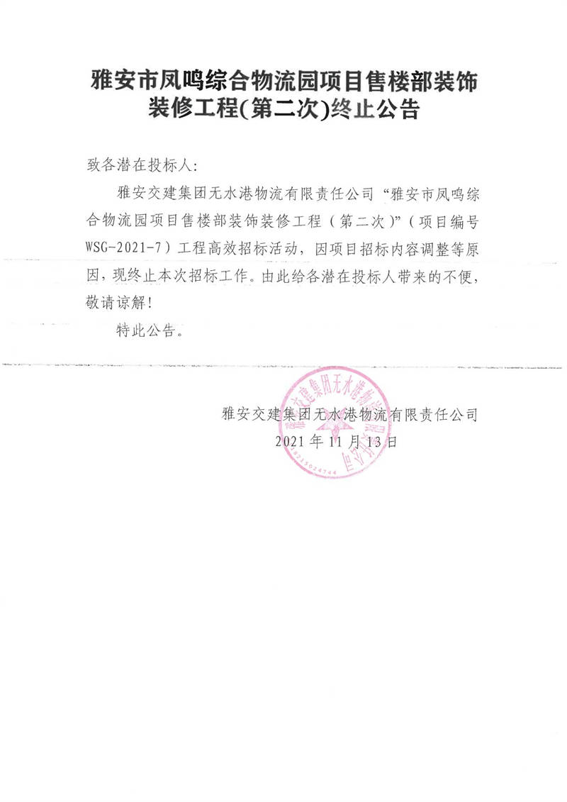 雅安交建集團(tuán)無(wú)水港物流有限責(zé)任公司雅安市鳳鳴綜合物流園項(xiàng)目售樓部裝飾裝修工程(第二次)終止公告