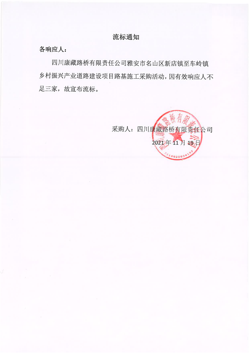 四川康藏路橋有限責(zé)任公司雅安市名山區(qū)新店鎮(zhèn)至車嶺鎮(zhèn)鄉(xiāng)村振興產(chǎn)業(yè)道路建設(shè)項(xiàng)目路面施工采購流標(biāo)通知