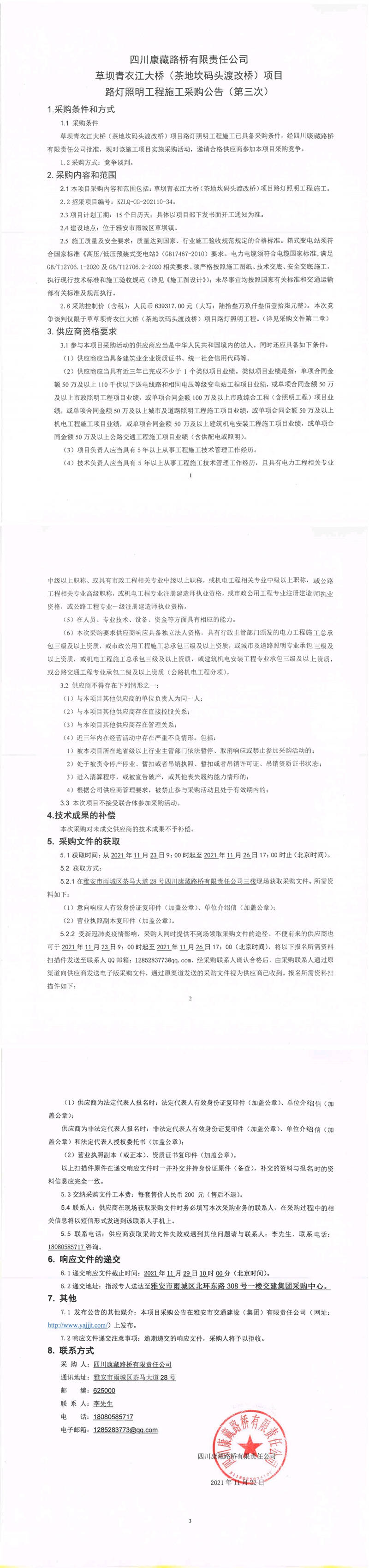 四川康藏路橋有限責任公司草壩青衣江大橋(茶地坎碼頭渡改橋)項目路燈照明工程施工采購公告(第三次)