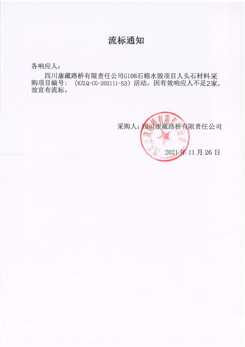四川康藏路橋有限責任公司G108石棉水毀項目人頭石材料采購流標通知